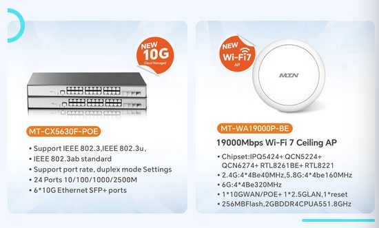 邁騰電子將攜GPON/XGSPON、5G CPE、5G MBB&FWA、交換機、Wifi7無線路由、AI-IPC、云網絡產品等最新科技成果及應用與您相約盛會共探行業趨勢、共謀合作發展,共啟網絡通信智慧與創新的數字世界的無限可能。